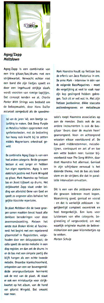| Bij al deze omleidingen fungeert Frank Wingold als gids. Niet zelden doet de gitarist, die al in 1993 op de Brusselse European Jazz Contest werd uitgeroepen tot beste solist, denken aan een kruising tussen Marc Ribot en Frank Zappa, alleen dan zonder de stilistische begrenzing die een dergelijke kwalificatie inhoudt. Hij grossiert in bevreemdende dissonanten, die hij liefst ook nog met pedalen op elkaar stapelt. Zijn vocabulaire strekt zich verder uit tot reggae chops, pingelende highlife-patroontjes en het brullende straaljagersgeluid waarop hardcore bands als Fugazi patent hebben. Maar eigenlijk is het een beetje oneerlijk om Wingold zonder meer tot solistisch epicentrum van de band te bombarderen. De andere twee leden van Agog, drummer Joost Lijbaart en bassist Mark Haanstra, evenaren hem namelijk in virtuositeit. En een dergelijke beschrijving doet vooral tekort aan de kracht en coherentie die het drietal als collectief uitstraalt. (...) En anders dan bij sommige bands waar het mengen van verschillende stijlen een knip-en-plak-kunstje is, weet dit trio er een overtuigend eigen geluid uit te destilleren. Agog raast langs de grenzen tussen jazz, rock, kamermuziek en volksmuziek, en weet die balanceeract te vangen in complexe composities vol absurde wendingen en aanstekelijke grooves. NRC Handelsblad, october 2001 Veelzijdig trio doorstaat vuurproef in jazzcafé Dizzy (...) Elektrische gitaar en bas doen een powertrio vermoeden, maar Agog neigt eerder naar kamermuziek. Clean gitaargeluid en de warme houtachtige sound van bassist Mark Haanstra zijn trefzeker geboetseerd rond de lichte aanslag van drummer Joost Lijbaart. Geïnspireerd door jazzveteranen van de oude stempel neemt deze zijn bekkens als uitgangspunt. (...) Man voor man zijn de Agog-leden talentvolle musici, alledrie opgeleid aan het Hilversums conservatorium. De Duitser Frank Wingold (32) die inmiddels in Keulen woont, is er cum laude afgestudeerd. Dat verbaast niemand die hem hoort. De elektrische gitaar kent voor hem geen geheimen. Gebruikmakend van elektronische effecten (echo en sampling) leek hij met name in het openingsnummer Sleepy Chipmunk meer dan één instrument te bespelen. Alle gespeelde composities waren gistermiddag van Wingold. De gitarist liet letterlijl horen dat agogiek staat voor ´leer der wijziging in het tempo aangebracht ter wille van expressieve voordracht´. |
